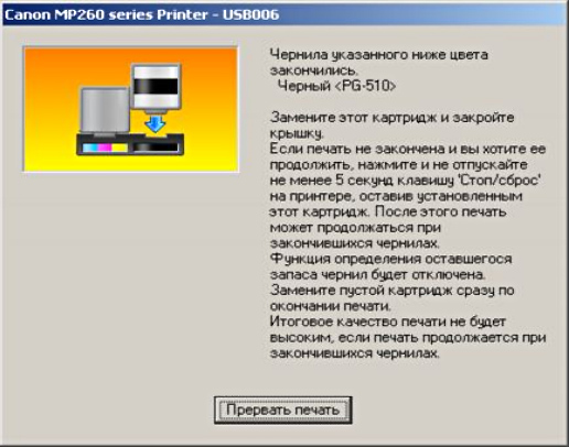 Итак, Ваши действия по отключению функции определения запаса чернил, если на экране появилось сообщение с текстом «Чернила указанного ниже цвета закончились»: